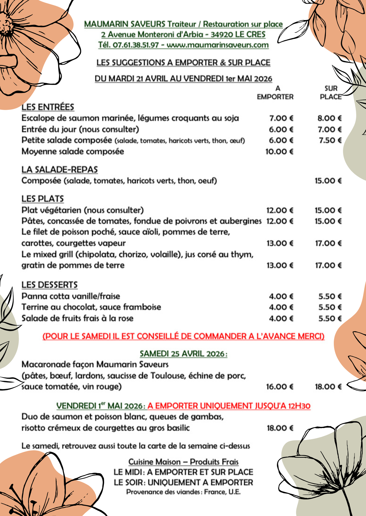 Vous pouvez emporter vos plats midi et soir (du Mardi au Samedi)