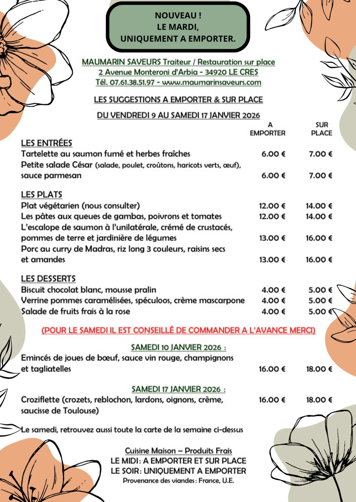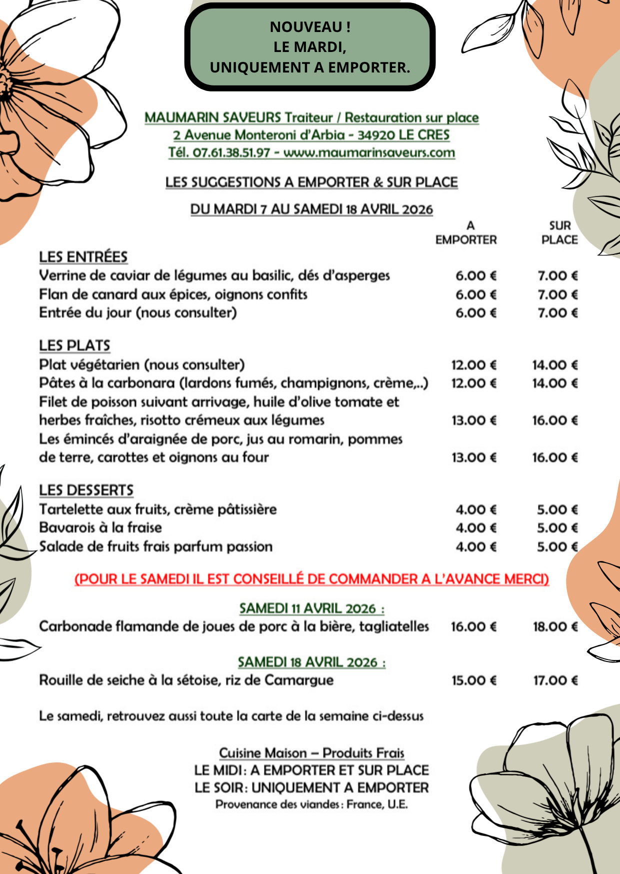 Vous pouvez emporter vos plats midi et soir, ou manger sur place (uniquement le midi). Du Mardi au Samedi.